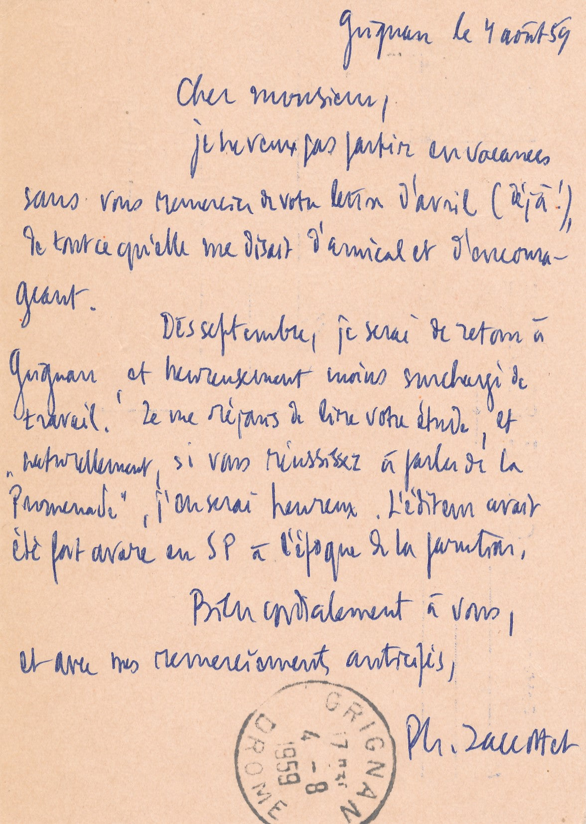 En septembre, il sera de retour à Grignan et sera moins surchargé de travail. « Je me réjouis de votre étude et naturellement si vous réussissez à parler de La Promenade j’en serai heureux ».
