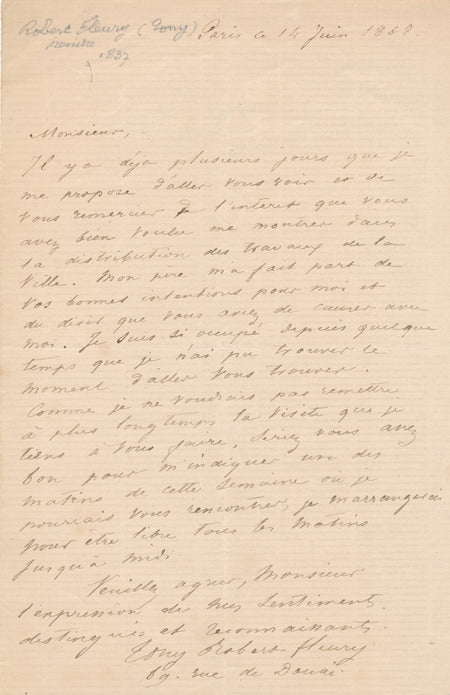 XIXe s. Tony Robert Fleury peintre lettre autographe signée la ville lui distribue des travaux €90,00
