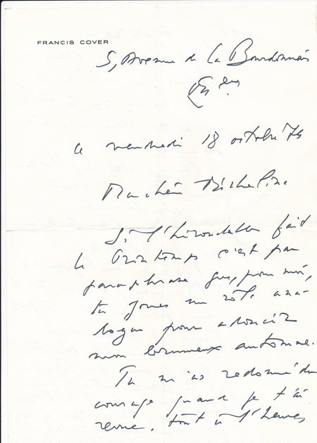 Francis COVER est mis sur la touche lettre autographe signée chanson